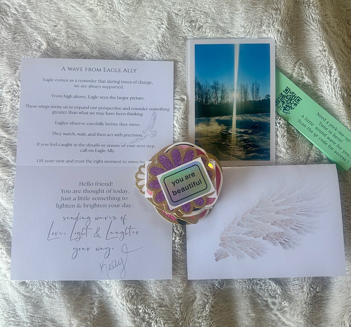 There is something deeply joyful about receiving something real in your hands — a small piece of love, light, and laughter arriving through the mail. In a world that moves so quickly through screens and notifications, Sacred Wave is a return to something tangible, something you can open, hold, and feel.